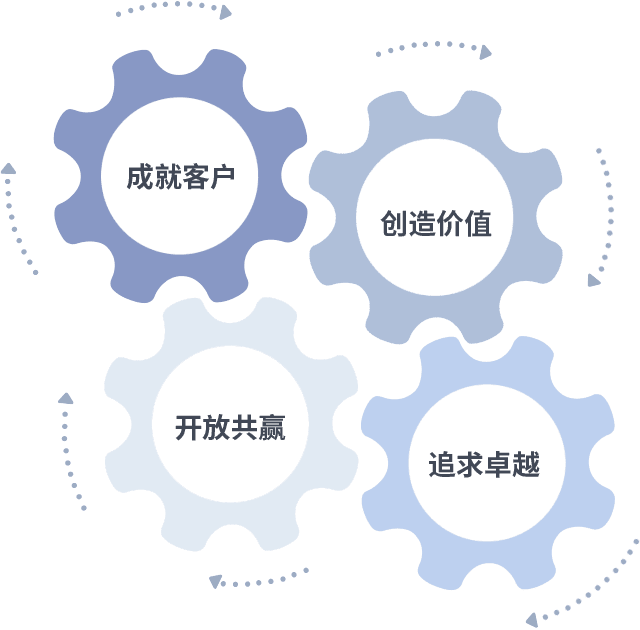 成就客户是一切决策的出发点,,创造价值是衡量所有工作的标准,,追求卓越是我们做事做人的态度,,,,开放共赢是我们的格局也是最终的结果。。。。价值观的齿轮环环相扣,,,,推动着组织里的每个人不断向前。。。